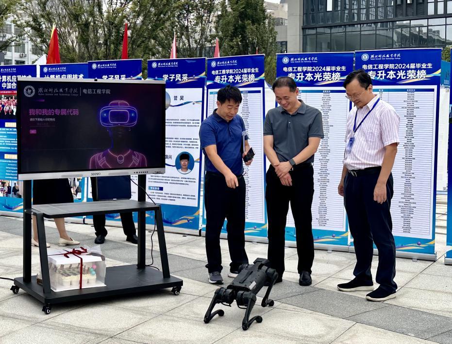 科技迎新,让梦想“智引未来”。“看到我的专属代码,就像拿到另一张身份证!”“哇!好想知道这只机器小狗的运行原理以及操作方法!”迎新现场,为充分展现专业优势、激发新生专业学习热情,学院特别为新生设置了“我和我的专属代码”、“机器小狗”两个科技体验区。活动现场,新生在电子屏幕上输入姓名,即会自动生成“专属代码”作为开学纪念,在场新生及家长纷纷与其合影留恋;而现场灵动有趣的“机器小狗”更是吸引全场目光,不少新生在指导下与机器小狗展开互动,“作揖、打滚、追逐”等流畅动作更是让新生惊叹不已,并表示入校后要不断锤炼技能,追逐科技创新前沿,励志未来在专业上成为技能高手。