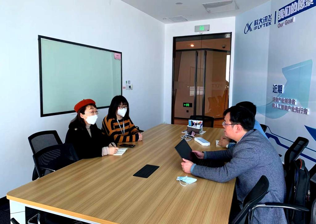 科大讯飞湖北大区校企合作总监王峰和人力资源部经理出席接待,介绍了湖北区域人工智能产业的发展态势以及企业情况,重点介绍了公司及其生态企业对不同岗位人才的需求。双方就人才培养体系、对接岗位的实训课程设置、学生实习就业、横向科研课题等问题进行了深度交流。
