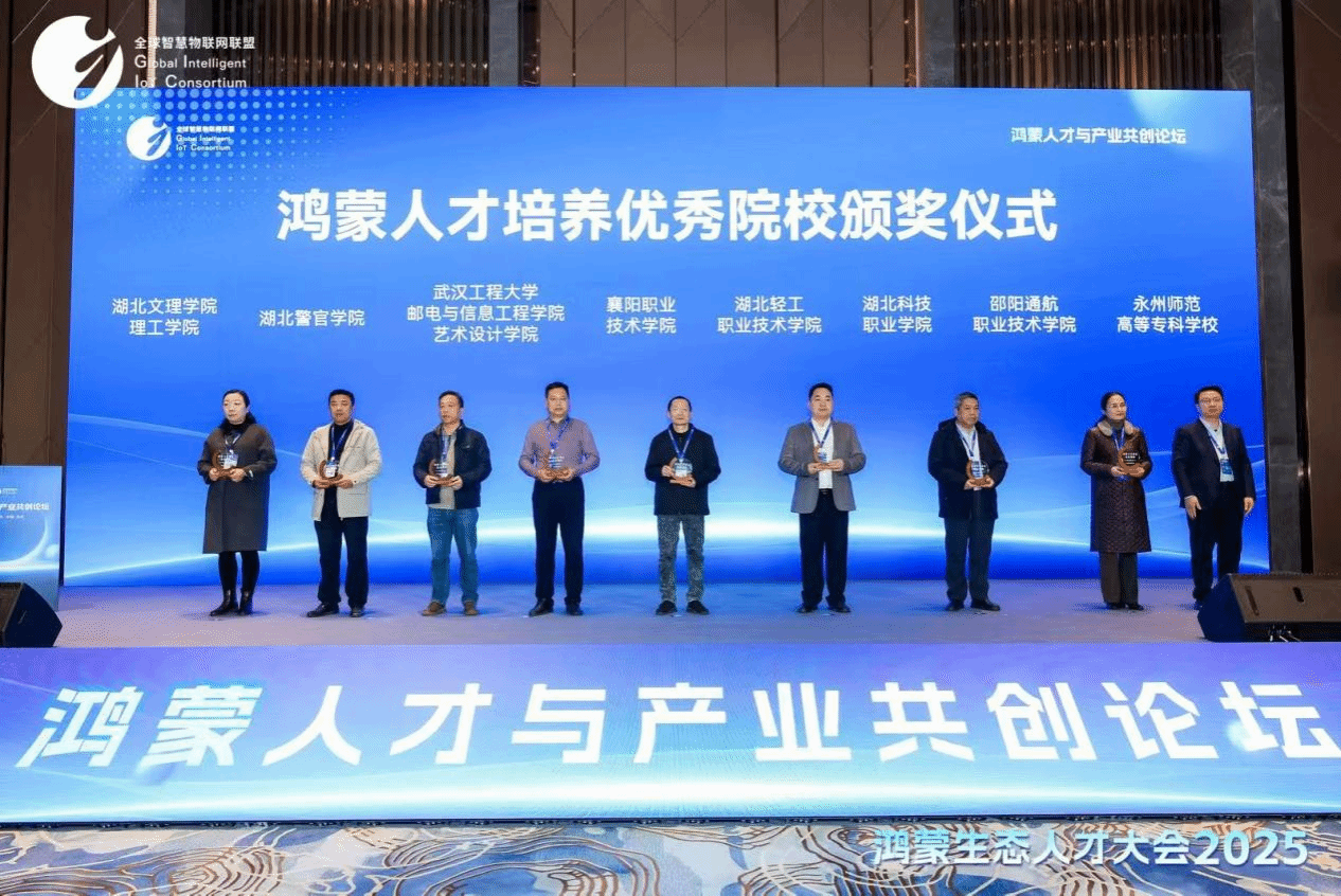本网讯(通讯员 李渊 文/图)12月27日,由全球智慧物联网联盟(GIIC)主办、鸿蒙生态服务(深圳)有限公司与鸿蒙生态(武汉)创新中心联合承办的“鸿蒙生态人才大会2025”在光谷科技会展中心举行。我校人工智能学院代表学校受邀参会。