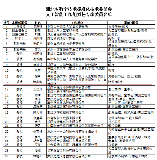 据了解,湖北省数字技术标准化技术委员会人工智能工作组由省市场监督管理局批准筹建,主要负责我省人工智能软件等数字技术领域地方标准制修订及相关标准化工作。此次委员遴选严格依据《中华人民共和国标准化法》《湖北省地方标准管理办法》等相关规定,经筹建单位面向社会征集、遴选产生,入选专家涵盖高校、科研院所、政府部门及行业龙头企业等多个领域,旨在汇聚多方智慧推动湖北省人工智能领域标准化建设与产业高质量发展。本次遴选产生委员有27名,其中高校委员7人。