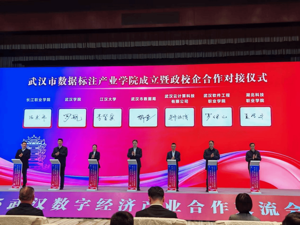 本网讯(通讯员 李渊 文/图)12月18日,武汉市数据局主办的2025武汉数字经济产业合作交流会在武汉市会议中心举办,全国首个数据标注产教融合中心在武汉正式启用,由湖北科技职业学院等5所武汉本地院校组建的武汉市数据标注产业学院正式成立,副校长夏学文出席成立仪式。